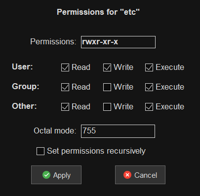 current permissions are 644 attempted to change to 777 and won't save the changes.